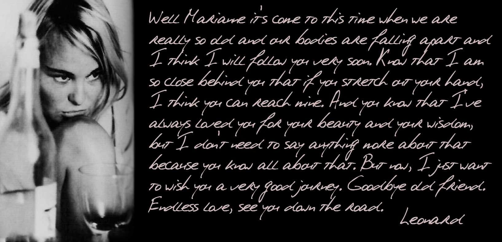 I have become a Leonard Cohen fan just within the last few weeks after buying and listening to The Essential Leonard Cohen. I will be buying all the albums and know that I will be listening and studying them for many years to come. I discovered your site a few days ago, only to discover that shortly it will no longer exist. I am not yet sure where I will go with our curiosity and hunger about this man and his work. But I am grateful for what I have been able to see and read here in these few days. It is obvious how much love went into what you have done, and so thank you. In a way I represent all the future discoverers of Leonard Cohen who will have never gotten the chance to see him live or to anticipate new music. We hope your work on finding a way to accessibly archive your work bears fruit.